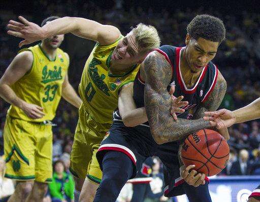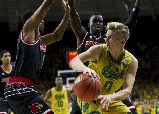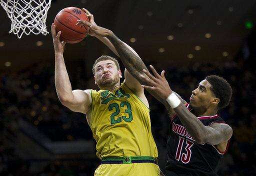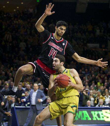 Louisville, a game behind 5-0 Virginia in the ACC, won at Notre Dame for the first time since February 1994, ending a streak of six straight losses at Purcell Pavilion.