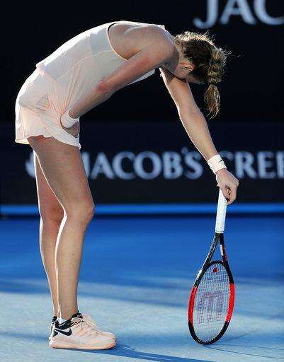 Petra Kvitova of the Czech Republic bends over while playing Germany's Andrea Petkovic during their first round match at the Australian Open tennis championships in Melbourne, Australia, Tuesday, Jan. 16, 2018. (AP Photo/Vincent Thian) The Associated Press