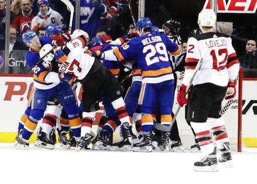 The Islanders' Brock Nelson and New Jersey captain Andy Greene tussled briefly in front of the Devils' net as time expired in the first. It was the first NHL fight for each.