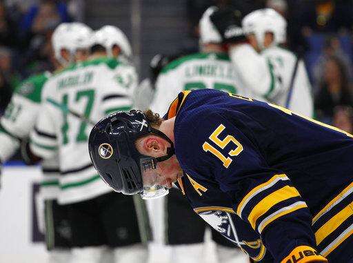 Buffalo Sabres forward Jack Eichel (15) reacts as the Dallas Stars players celebrate a goal during the second period of an NHL hockey game, Saturday, Jan. 20, 2018, in Buffalo, N.Y. (AP Photo/Jeffrey T. Barnes) The Associated Press