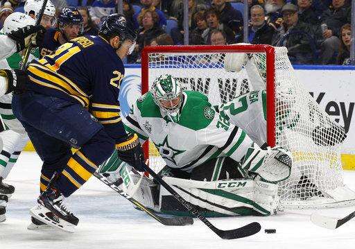 Buffalo Sabres forward Kyle Okposo (21) is stopped by Dallas Stars goalie Kari Lehtonen (32) during the first period of an NHL hockey game, Saturday, Jan. 20, 2018, in Buffalo, N.Y. (AP Photo/Jeffrey T. Barnes) The Associated Press