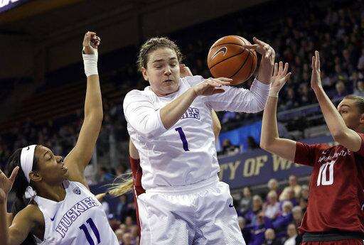 Washington's Hannah Johnson (1) reaches for a rebound between Kierra Collier (11) and Johanna Muzet (10), of France, in the first half of an NCAA college basketball game Sunday, Jan. 21, 2018, in Seattle. (AP Photo/Elaine Thompson) The Associated Press
