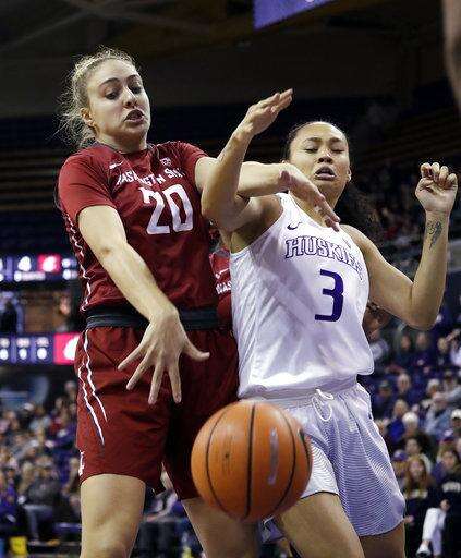 Washington State's Maria Kostourkova (20), of Portugal, and Washington's Mai-Loni Henson (3) eye a loose ball in the first half of an NCAA college basketball game Sunday, Jan. 21, 2018, in Seattle. (AP Photo/Elaine Thompson) The Associated Press