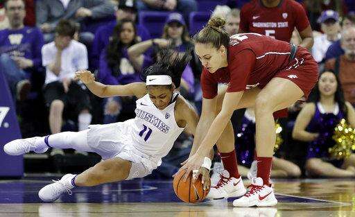 Washington's Kierra Collier (11) and Washington State's Maria Kostourkova, of Portugal, both reach for a loose ball in the first half of an NCAA college basketball game Sunday, Jan. 21, 2018, in Seattle. (AP Photo/Elaine Thompson) The Associated Press