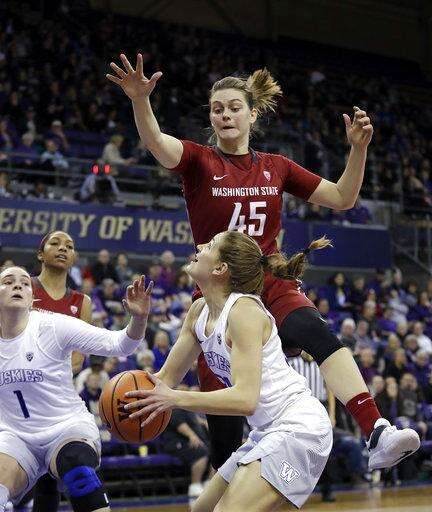 Washington's Jenna Moser, front, gets a shot off as Washington State's Borislava Hristova, of Bulgaria, defends in the first half of an NCAA college basketball game Sunday, Jan. 21, 2018, in Seattle. (AP Photo/Elaine Thompson) The Associated Press