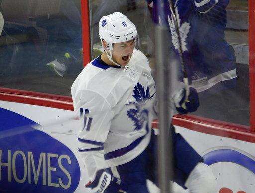 Toronto Maple Leafs center Zach Hyman (11) reacts after scoring against the Ottawa Senators during the first period of an NHL hockey game Saturday, Jan. 20, 2018, in Ottawa, Ontario. (Adrian Wyld/The Canadian Press via AP) The Associated Press