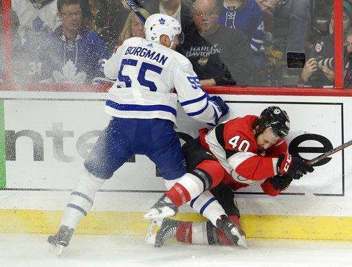 Toronto Maple Leafs defenseman Andreas Borgman (55) checks Ottawa Senators center Gabriel Dumont (40) into the boards during the first period of an NHL hockey game Saturday, Jan. 20, 2018, in Ottawa, Ontario. (Adrian Wyld/The Canadian Press via AP) The Associated Press