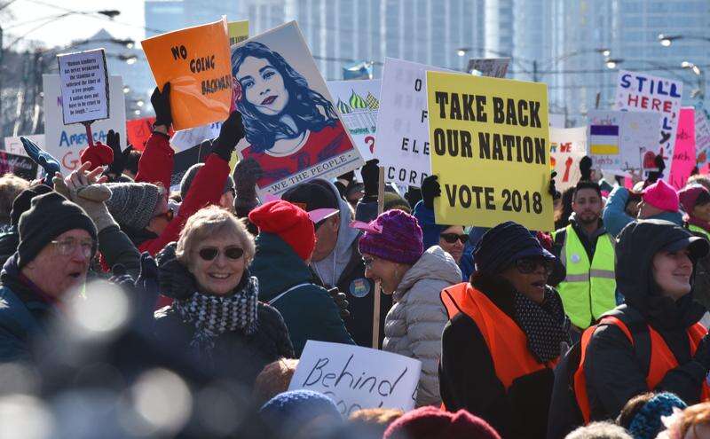Elaine Nekritz, foreground, a retired State Rep. from Northbrook, stands near the main stage of the Women's March Chicago in Grant Park Saturday. Organizers said 300,000 people came to the event.