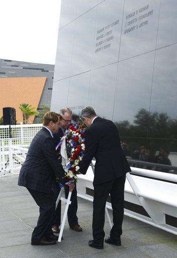 From left to right, Thad Altman, President and CEO of The Astronauts Memorial Foundation, Therrin Protze COO, Delaware North and Robert Cabana, Director of the Kennedy Space Center place a wreath at the Space Mirror Memorial at Kennedy Space Center Visitor Complex, in Fla., Thursday, Jan. 25, 2018, during the center's annual day of remembrance. The annual event honors those who perished in the space program. (Craig Bailey /Florida Today via AP) The Associated Press