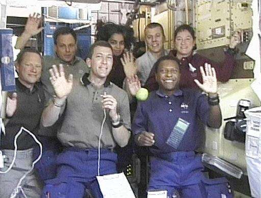 FILE - In this Jan. 20, 2003, file photo, astronauts aboard Columbia's Spacehab David Brown, left, Israeli astronaut Ilan Ramon, second from left back row, commander Rick Husband, front row second from left, astronaut Kalpana Chawla, back row third from left, pilot William McCool, back row fourth from left, astronaut Michael Anderson, front row right, and astronaut Laurel Clark, wave to a television camera as a floating apple is seen in this view. NASA honored the seven astronauts killed aboard shuttle Columbia 15 years ago, with a special musical tribute Thursday, Jan. 25, 2018, by the son of Ramon, Israel’s first astronaut. (AP Photo/NASA TV, File) The Associated Press