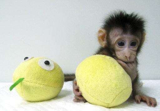 In this undated photo provided by the Chinese Academy of Sciences, cloned monkey Hua Hua sits with a fabric toy. For the first time, researchers have used the cloning method that produced Dolly the sheep to create two healthy monkeys, potentially bringing scientists closer to being able to do that with humans. (Sun Qiang and Poo Muming/Chinese Academy of Sciences via AP) The Associated Press