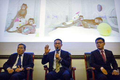 Sun Qiang, center, the director of the Nonhuman Primate Facility of the Institute of Neurosciences at the Chinese Academy of Sciences, speaks as Poo Muming, left, director of the Institute of Neurosciences and Liu Zhen, right, a postdoctoral researcher at the Institute of Neurosciences listen during a press conference at the Chinese Academy of Sciences in Beijing, Wednesday, Jan. 24, 2018. For the first time, researchers have used the cloning method that produced Dolly the sheep to create two healthy monkeys, potentially bringing scientists closer to being able to do that with humans. (AP Photo/Mark Schiefelbein) The Associated Press