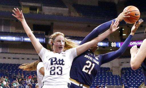 Pittsburgh's Kauai Bradley, right, and Notre Dame's Jackie Young battle for the ball during the first half of an NCAA college basketball game, Thursday, Jan. 25, 2018, in Pittsburgh. (AP Photo/Keith Srakocic) The Associated Press
