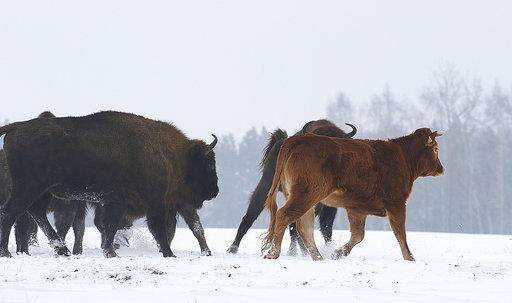 Rafal Kowalczyk, a bison expert who has managed to photograph the unusual sight, said the cow seems to be in good condition. That indicates that she is managing to find food, even though she is sometimes spotted on the margins of the herd. Thick fur common to her Limousin breed and the mild winter in eastern Poland so far this year have also helped her, he told The Associated Press on Thursday.