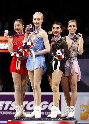 FILE - In this Jan. 5, 2018, file photo, Bradie Tennell, second from left, poses after winning the women's free skate event with second place finisher Mirai Nagasu, left, third place finisher Karen Chen, second from right, and fourth place finisher Ashley Wagner at the U.S. Figure Skating Championships in San Jose, Calif. Chen, the 2017 national champ, slid back for much of this season, then had a strong showing at nationals to earn a spot for Pyeongchang. The 17-year-old Chen could use some polish, yet she can be mesmerizing to watch. (AP Photo/Tony Avelar, File) The Associated Press