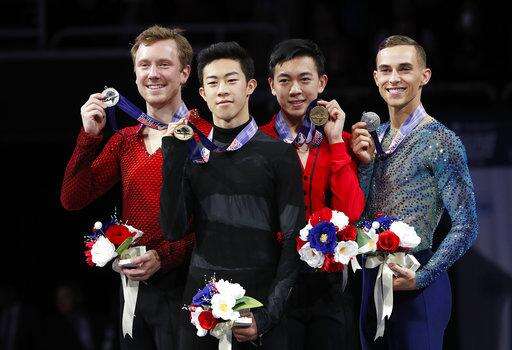FILE - In this Jan. 6, 2018, file photo, Nathan Chen, foreground, smiles after winning the men's skating competition between Ross Miner, left, who finished second, Vincent Zhou, second from right, who finished third, and Adam Rippon, who finished fourth, at the U.S. Figure Skating Championships in San Jose, Calif. Rippon, 28, was added to the U.S. Olympic squad in place of Ross Miner after finishing fourth at nationals. A committee felt the veteran has a stronger international resume, and his flair for the dramatic in his programs goes over well with the crowds and could also land him in the top 10. (AP Photo/Tony Avelar, File) The Associated Press