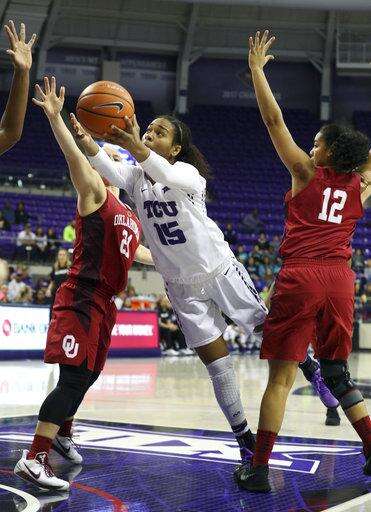 TCU guard Jayde Woods (15) drives to the basket between Oklahoma Sooners guard Gabbi Ortiz (21) and guard Gileysa Penzo (12) during an NCAA college basketball game in Fort Worth, Texas, Saturday, Jan. 27, 2018. (Richard W. Rodriguez/Star-Telegram via AP)