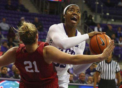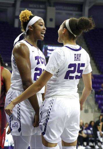 TCU center Jordan Moore (22) and guard Kianna Ray (25) celebrate after a basket against Oklahoma during an NCAA college basketball game in Fort Worth, Texas, Saturday, Jan. 27, 2018. (Richard W. Rodriguez/Star-Telegram via AP)