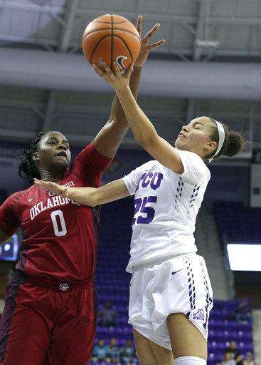 Oklahoma guard Gabbi Ortiz (21) fouls TCU forward Adeola Akomolafe (33) as she goes take a shot during an NCAA college basketball game in Fort Worth, Texas, Saturday, Jan. 27, 2018. (Richard W. Rodriguez/Star-Telegram via AP)