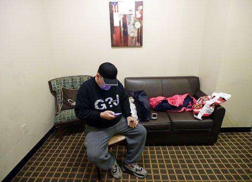 In this Jan. 9, 2018 photo, Fernando Moyet uses his cell phone in the hotel where he's living with his family in the Brooklyn borough of New York, after Hurricane Maria destroyed their home in Puerto Rico. Moyet, who worked as a cook at an Army base near San Juan, Puerto Rico, is currently looking for work as his family is stuck in limbo. (AP Photo/Frank Franklin II) The Associated Press
