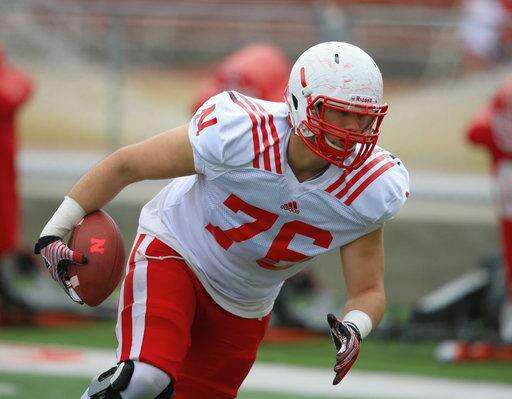 FILE- In this March 18, 2015, file photo, Nebraska defensive lineman Dylan Owen (76) carries the ball during NCAA college football spring practice in Lincoln, Neb. Nebraska receiver Tyjon Lindsey and walk-on defensive lineman Dylan Owen were hospitalized after falling ill during winter conditioning drills, coach Scott Frost confirmed to two newspapers Tuesday, Jan. 30, 2018. (AP Photo/Nati Harnik, File) The Associated Press
