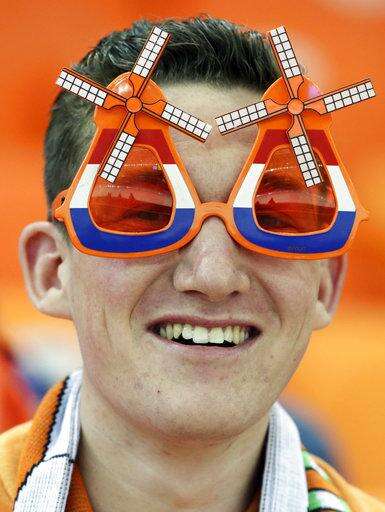 FILE In this Tuesday, Feb. 18, 2014 file photo a Dutch skating fans wears glasses in the shape of windmills as he watches the men's 10,000-meter speedskating race at the Adler Arena Skating Center during the 2014 Winter Olympics in Sochi, Russia. Count on the Dutch to dominate the oval at the PyeongChang Olympics, but don't expect them to suffocate opposition like they did in Sochi four years ago. They turned the Olympic hall into a sea of their national color, orange, courtesy of a massive haul of 23 of 36 medals, including eight out of 12 golds. (AP Photo/Matt Dunham, File) The Associated Press