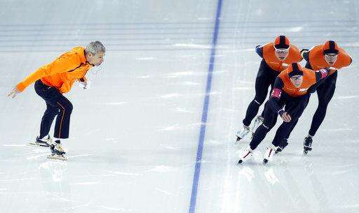 FILE In this Friday, Feb. 21, 2014 file photo coach Arie Koops of The Netherlands, left, shouts directions to speedskaters Jan Blokhuijsen, foreground, Sven Kramer, right, and Koen Verweij, rear, as they compete in the men's speedskating team pursuit semifinals at the Adler Arena Skating Center during the 2014 Winter Olympics in Sochi, Russia. Count on the Dutch to dominate the oval at the PyeongChang Olympics, but don't expect them to suffocate opposition like they did in Sochi four years ago. They turned the Olympic hall into a sea of their national color, orange, courtesy of a massive haul of 23 of 36 medals, including eight out of 12 golds. (AP Photo/Pavel Golovkin, File) The Associated Press