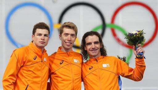 In this Tuesday, Feb. 18, 2014 file photo athletes from the Netherlands, from left to right, silver medallist Sven Kramer, gold medallist Jorrit Bergsma, and bronze medallist Bob de Jong stand on the podium during the flower ceremony for the men's 10,000-meter speedskating race at the Adler Arena Skating Center during the 2014 Winter Olympics in Sochi, Russia. Count on the Dutch to dominate the oval at the PyeongChang Olympics, but don't expect them to suffocate opposition like they did in Sochi four years ago. They turned the Olympic hall into a sea of their national color, orange, courtesy of a massive haul of 23 of 36 medals, including eight out of 12 golds. (AP Photo/Patrick Semansky, File) The Associated Press