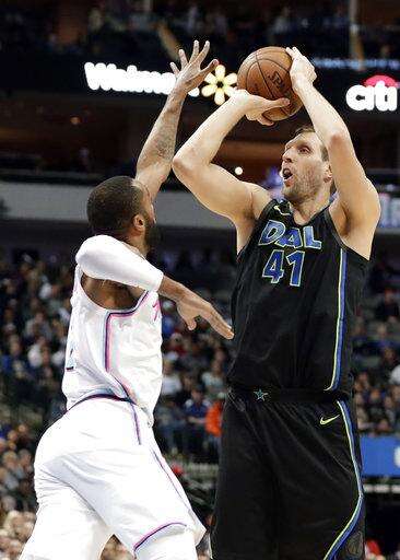 Mavericks: Nowitzki has played 49,941 career minutes, 59 shy of becoming the sixth player in NBA history with 50,000. Elvin Hayes played exactly 50,000 minutes, and former Mavericks guard Jason Kidd is fourth on the list at 50,111. "It's a very staggering accomplishment and done with such grace and such little hype that it's probably very much taken for granted," coach Rick Carlisle said. ... G J.J. Barea missed his second straight game because of a left oblique strain. ... Devin Harris was back after missing four games because of a concussion and personal reasons. He was 1-of-7 shooting in 16 1/2 minutes.