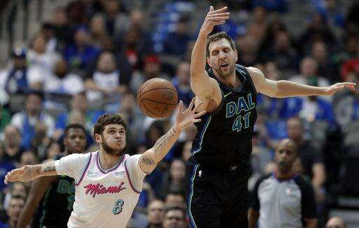 Miami Heat guard Tyler Johnson (8) and Dallas Mavericks forward Dirk Nowitzki (41), of Germany, chase the ball in the first half of an NBA basketball game Monday, Jan. 29, 2018, in Dallas. (AP Photo/Tony Gutierrez) The Associated Press