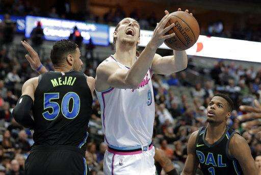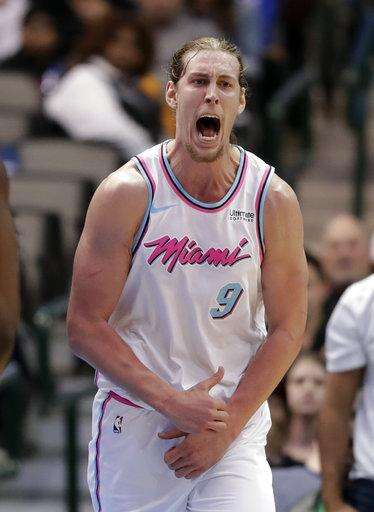 Miami Heat center Kelly Olynyk (9) celebrates scoring against the Dallas Mavericks in the second half of an NBA basketball game Monday, Jan. 29, 2018, in Dallas. (AP Photo/Tony Gutierrez) The Associated Press