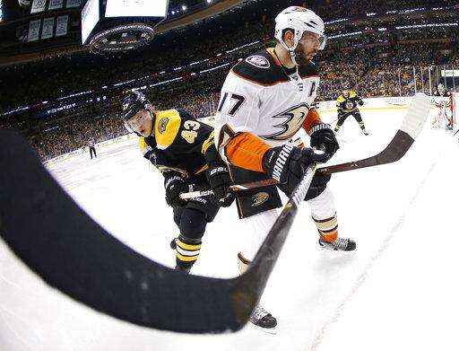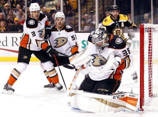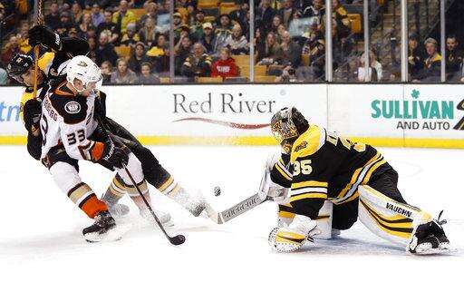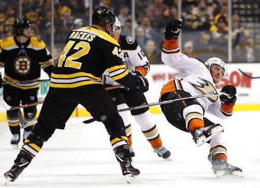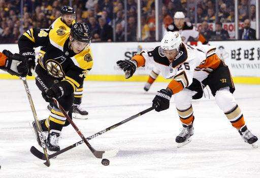 NOTES: The Ducks opened a five-game road trip against Atlantic Division teams. ... Boston LW Anders Bjork left after the first period with an upper-body injury. ... Boston was without leading scorer Brad Marchand, who sat out the second of a five-game suspension for throwing an elbow last week against New Jersey.