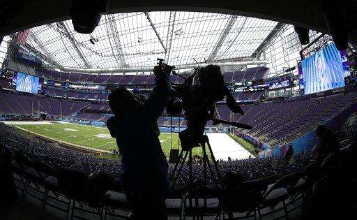 A videographer shoots video of U.S. Bank Stadium as workers get it ready for Super Bowl 52 on Tuesday, Jan. 30, 2018, in Minneapolis. (AP Photo/Matt Slocum) The Associated Press