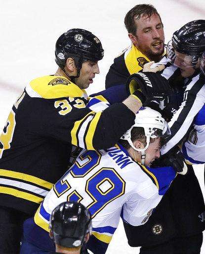Boston Bruins defenseman Zdeno Chara (33) separates St. Louis Blues defenseman Vince Dunn (29) away from Tim Schaller, right, during a fight in the third period of an NHL hockey game in Boston, Thursday, Feb. 1, 2018. (AP Photo/Charles Krupa) The Associated Press