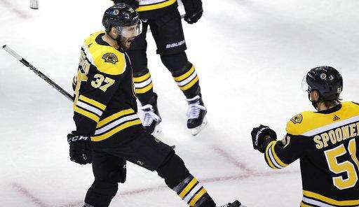Boston Bruins center Patrice Bergeron (37) celebrates after his goal during the third period of an NHL hockey game against the St. Louis Blues in Boston, Thursday, Feb. 1, 2018. (AP Photo/Charles Krupa) The Associated Press