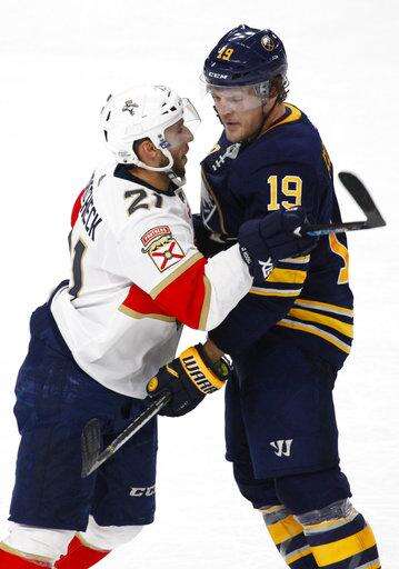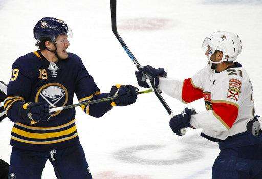 Buffalo Sabres Jake McCabe (19) and Florida Panthers Vincent Trocheck (21) exchange words during the third period of an NHL hockey game, Thursday, Feb. 1, 2018, in Buffalo, N.Y. (AP Photo/Jeffrey T. Barnes) The Associated Press