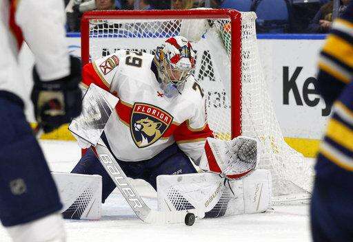 Florida Panthers goalie Harri Sateri (29) makes a save during the first period of an NHL hockey game against the Buffalo Sabres, Thursday, Feb. 1, 2018, in Buffalo, N.Y. (AP Photo/Jeffrey T. Barnes) The Associated Press