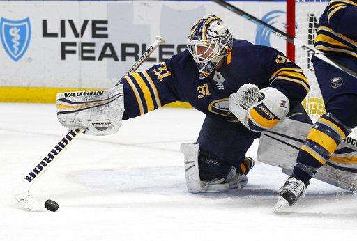 Buffalo Sabres goalie Chad Johnson (31) makes a save during the second period of an NHL hockey game against the Florida Panthers, Thursday, Feb. 1, 2018, in Buffalo, N.Y. (AP Photo/Jeffrey T. Barnes) The Associated Press
