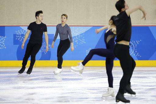 South Korea's Kim Kyueun and Kam Alex Kang Chan, left, skate next to North Korea's Ryom Tae Ok and Kim Ju Sik during a Pairs Figure Skating training session prior to the 2018 Winter Olympics in Gangneung, South Korea, Monday, Feb. 5, 2018. (AP Photo/Felipe Dana) The Associated Press