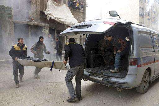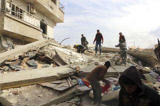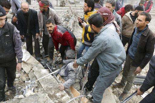 The Britain-based Syrian Observatory for Human Rights said 10 towns in the eastern Ghouta region outside Damascus were bombed on Tuesday. The activist-run Ghouta Media Center said at least two, Douma and Harasta, was struck by ground-to-ground missiles.