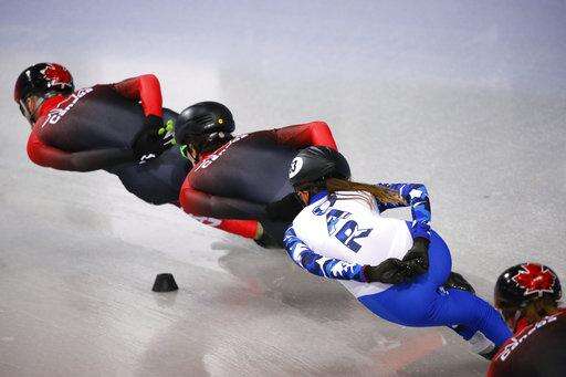 FILE - In this Feb. 3, 2018, file photo, wearing an Olympic uniform with the logo OAR - Olympic Athlete from Russia, Russian short track speed skater Ekaterina Efremenkova rounds the track with Canadian skaters during a training session prior to the 2018 Winter Olympics in Gangneung, South Korea. As punishment for doping offenses at the 2014 Sochi Games, the International Olympic Committee has forced Russian athletes competing in Pyeongchang to do so as OARs in neutral uniforms and with no national insignia. (AP Photo/Jae C. Hong, File) The Associated Press
