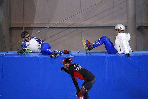 FILE - In this Feb. 3, 2018, file photo, wearing Olympic uniforms with the logo OAR - Olympic Athlete from Russia, Russian short track speed skaters Pavel Sitnikova, left, and Alexander Shulginov take a break during a training session prior to the 2018 Winter Olympics in Gangneung, South Korea. As punishment for doping offenses at the 2014 Sochi Games, the International Olympic Committee has forced Russian athletes competing in Pyeongchang to do so as OARs in neutral uniforms and with no national insignia. (AP Photo/Jae C. Hong, File) The Associated Press