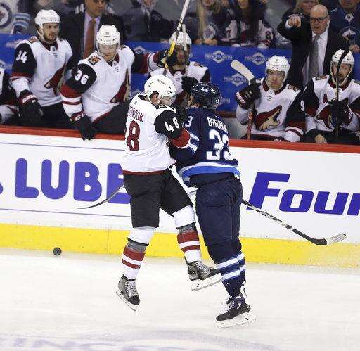 The Coyotes got back within a goal, taking advantage of a power play late in the first period. Dvorak grabbed the rebound off his own blocked shot and slid it under Hellebuyck just six seconds after Jets captain Blake Wheeler went off for holding.