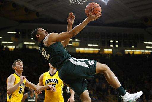 Michigan State guard Miles Bridges (22) drives to the basket past Iowa forward Nicholas Baer, left, during the first half of an NCAA college basketball game Tuesday, Feb. 6, 2018, in Iowa City, Iowa.(AP Photo/Charlie Neibergall) The Associated Press