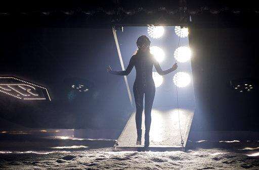A model, stepping from a spaceship like stage feature, wears fashion from the Philipp Plein collection during Fashion Week in New York, Saturday, Feb. 10, 2018. (AP Photo/Craig Ruttle) The Associated Press