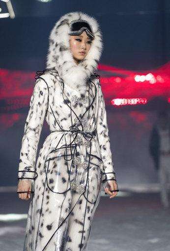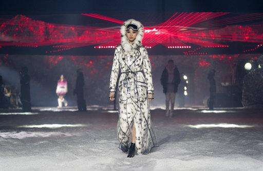 A model, walking through a snow scene created for the show, wears fashion from the Philipp Plein collection during Fashion Week in New York, Saturday, Feb. 10, 2018. (AP Photo/Craig Ruttle) The Associated Press