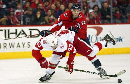 NOTES: Washington coach Barry Trotz said F Lars Eller, who signed a five-year, $17.5 million contract extension Saturday, should be able to play more confidently. "Now, he knows he's going to be here," Trotz said. "It makes us strong up the middle." ... Detroit F Todd Bertuzzi, who committed a costly penalty that led to the Red Wings' ugly loss to the Islanders on Friday, was a healthy scratch.