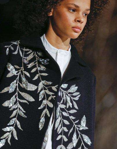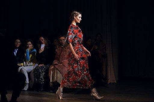 The show, which had a retro jazz soundtrack heavy on Ella Fitzgerald, started out with the basics - a white top with flowing sleeves and black wide-legged pants; a long, billowing black coat; a white coat with a flash of leopard fur on the sleeves. It then segued into more glamorous fare - dresses that could be worn to a formal function, and those clearly designed for a red carpet, with bright pops of color, including heavy doses of pink. There was a pink tuxedo outfit, a magical tulle pink and blue dress, and a black dress completely embellished with feathers that seemed to dance along with the music.