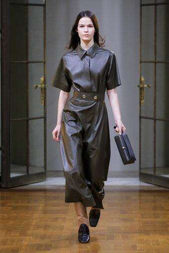 It was a collection heavy on workplace looks, with belted coats and jackets with defined shoulders and drawn-in waists. Her favorite item, Beckham said afterward, was a striking belted leopard-print coat, made from a chenille jacquard fabric that was based on Venetian upholstery. She also featured clingy leggings, ankle cuffs in leather, and a print on silk that resembled fur - "my take on fake fur," she explained afterward.