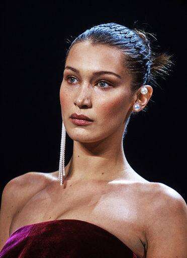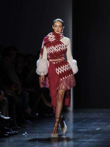 Bella Hadid took a slow walk around the bright sand art Gurung displayed on the floor wearing a strapless, royal-red cape gown with a gold cord belt. Gigi Hadid opened the show in a porcelain-white cashmere turtleneck with fox trim on the sleeves, an orchid-colored skirt and a draped sarong overlay that wound around her neck and fell below the waist.